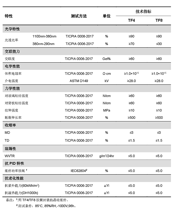 F·RST  TF4和TF8膠膜是杭州福斯特應用材料股份有限公司開發的一款交聯型聚烯烴封裝膠膜,具有高的水汽阻隔性、電氣絕緣性及優異的抗PID性能,對于PID敏感的電池如P型PERC雙面電池、N型PERT雙面電池、IBC電池等非常適用。同時TF系列膠膜特別適用于無封邊雙玻組件、高濕氣環境中的單玻組件等。
