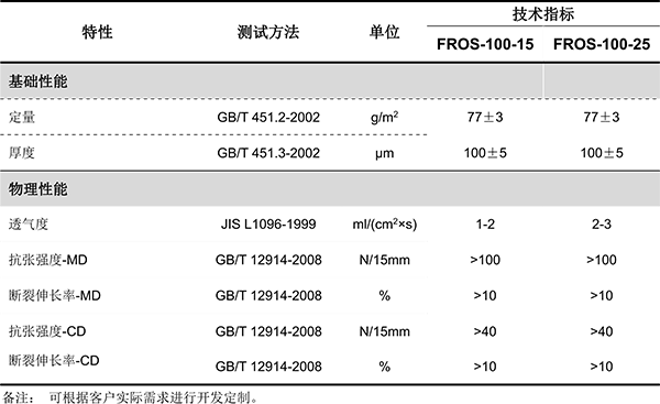FROS系列是專為反滲透膜開發的支撐材料,產品具有優異的均勻性和力學性能,克重、厚度均一,透氣度適中,可滿足反滲透膜的加工和使用要求。反滲透膜有不同的應用場景,不同產品的加工工藝存在差別,FROS系列支撐材料的透氣度等指標可進行針對性的調整,最大程度匹配客戶的工藝,滿足差異化需求。